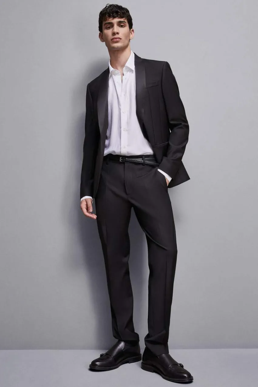 Die elegante Ein-Knopf-Jacke zeichnet sich durch ein Satin-Revers und Leistentaschen mit einer Brusttasche auf der Vorde…
