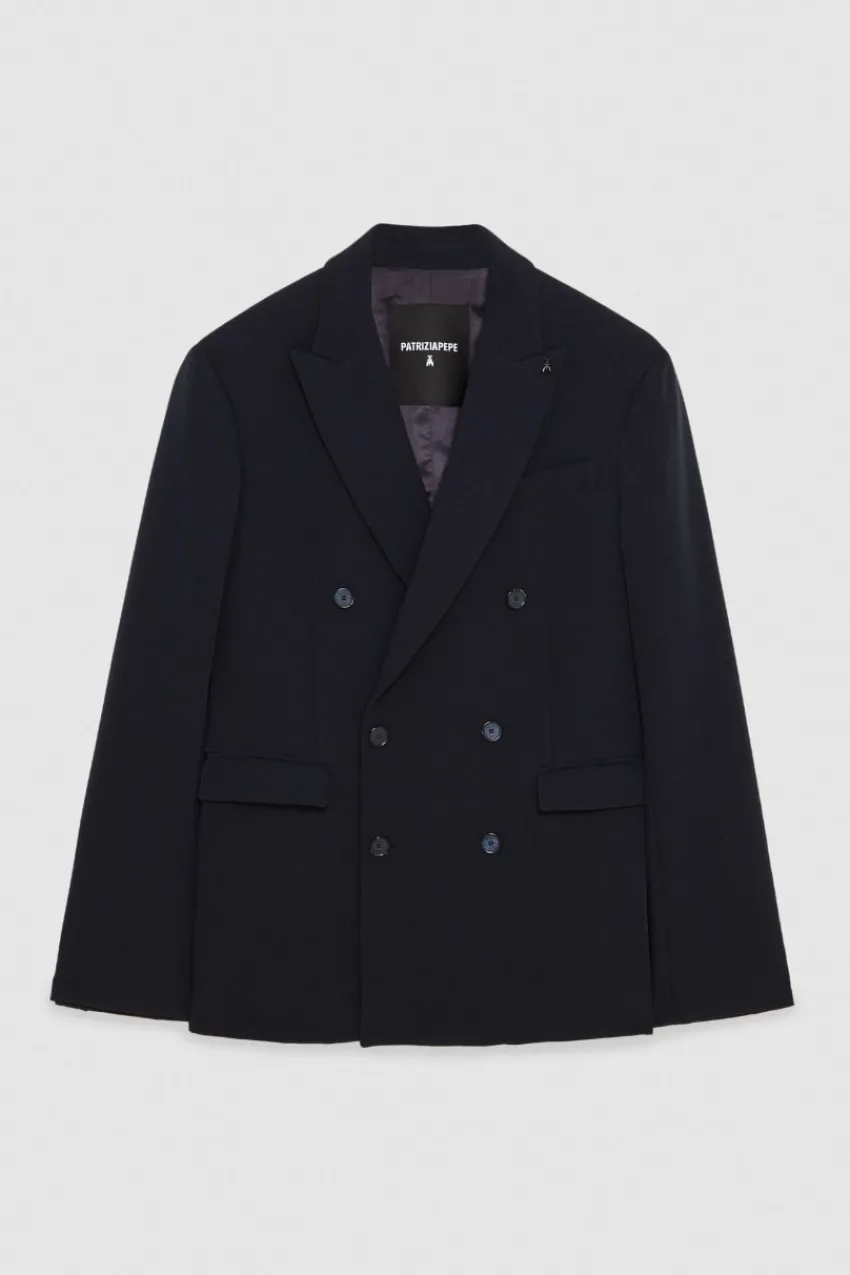 Die zweireihige Jacke mit Regular-Fit-Passform von Patrizia Pepe besticht durch ein spitzes Revers mit Fly-Anstecknadel. Das Modell verfügt über Leistentaschen, eine Brusttasche auf der Vorderseite und einen Schlitz auf der Rückseite.