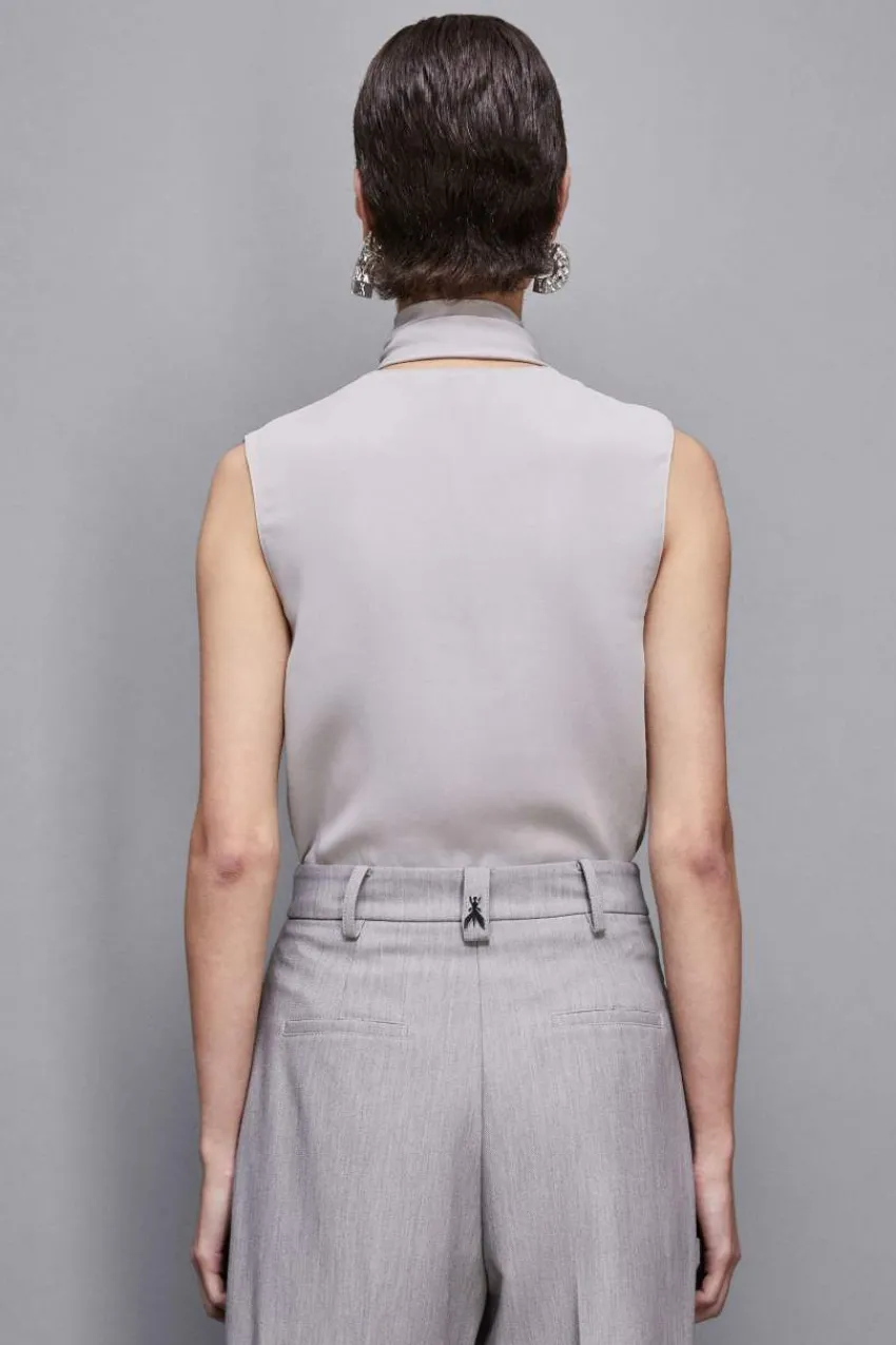 Diese ärmellose Bluse aus Viskose-Crepe verfügt über einen V-Ausschnitt mit Schärpe, die die Raffinesse ihres Designs unterstreicht, indem sie sanft über die Brust fällt.