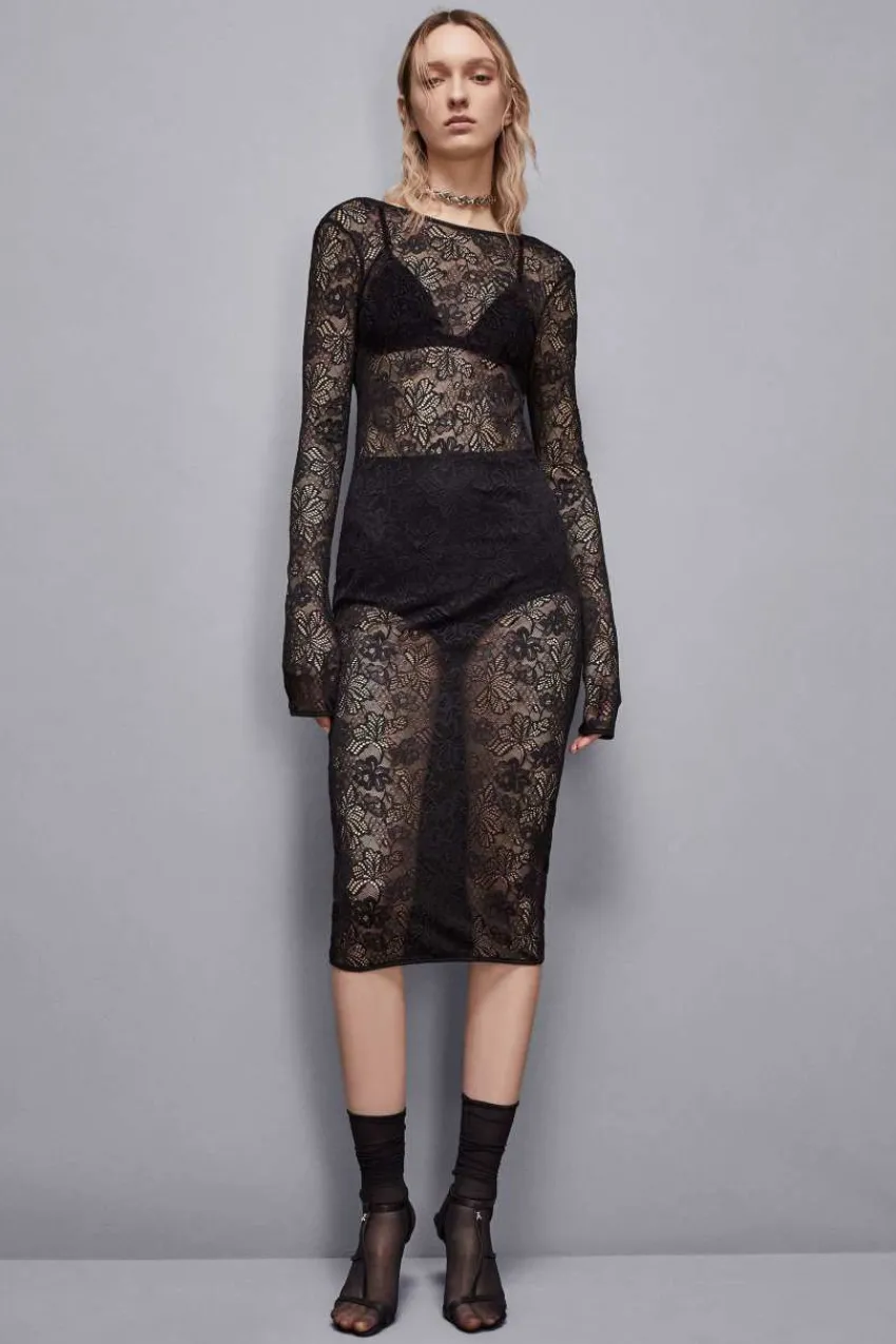 Bring in diesem Midikleid aus Spitzenjersey deine ganze Sinnlichkeit zum Ausdruck. Es zeichnet sich durch einen verführerischen „See through“-Effekt und einen Rückenausschnitt aus.