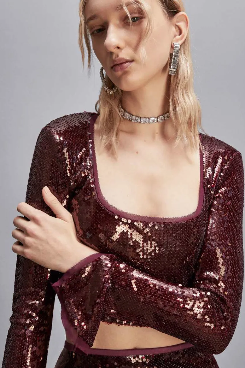 Unzählige Pailletten, die die besonderen Anlässe verschönern. Diese elegante und ausßergewöhnlich glamouröse Bluse hat ausgestellte Ärmel und eine normale Passform. Die Cropped-Länge verleiht dem Look eine supermoderne Ausstrahlung.